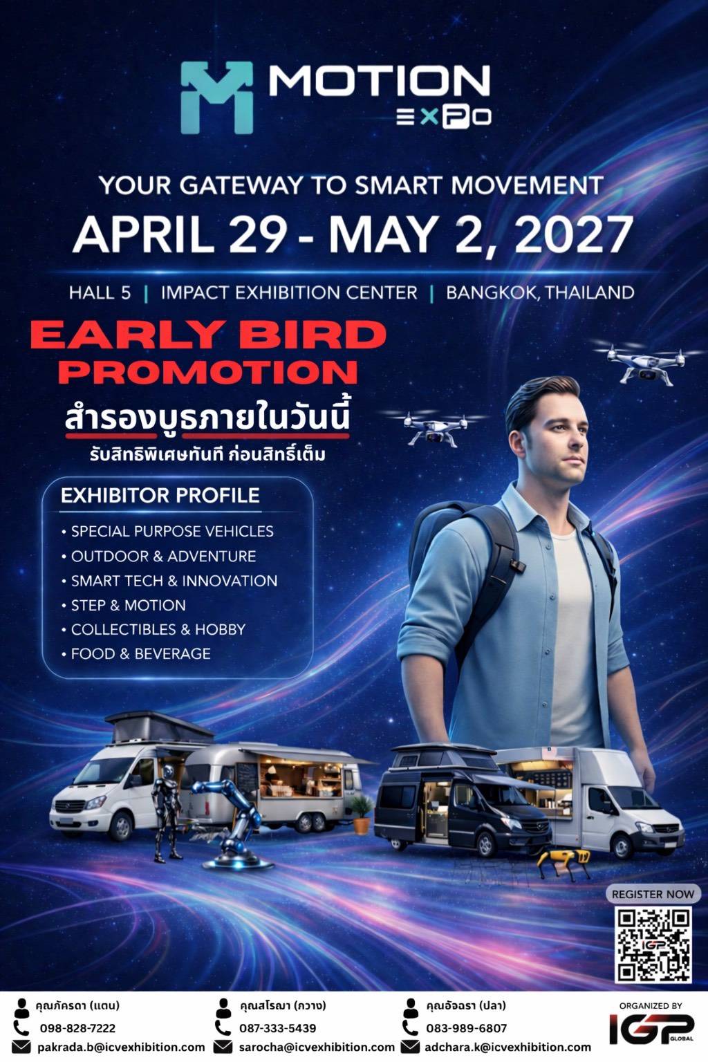 • Motion Expo งานแสดงนวัตกรรมและไลฟ์สไตล์การเคลื่อนที่แห่งอนาคต ภายใต้คอนเซ็ปต์ “Your Gateway to Smart Movement” ที่รวบรวมโลกของ “Mobility” ไว้ในที่เดียว ครอบคลุมตั้งแต่ยานยนต์ทุกรูปแบบของการใช้ชีวิต โดยผสาน Future Mobility, Outdoor & Adventure Lifestyle และ Smart Living Technology เพื่อสร้างแพลตฟอร์มที่เชื่อมโยงอุตสาหกรรม เทคโนโลยี และผู้บริโภค พร้อมยกระดับสู่เวทีธุรกิจและประสบการณ์ระดับภูมิภาค จัดขึ้นในวันที่ 29 เมษายน – 2 พฤษภาคม 2570 ณ ศูนย์แสดงสินค้าและการประชุม อิมแพ็ค เมืองทองธานี