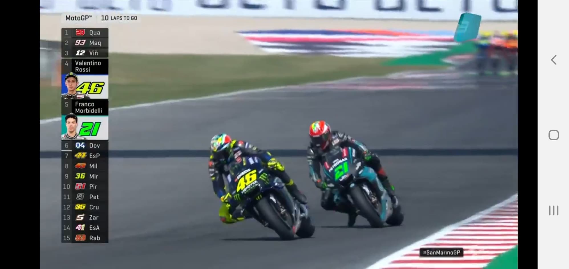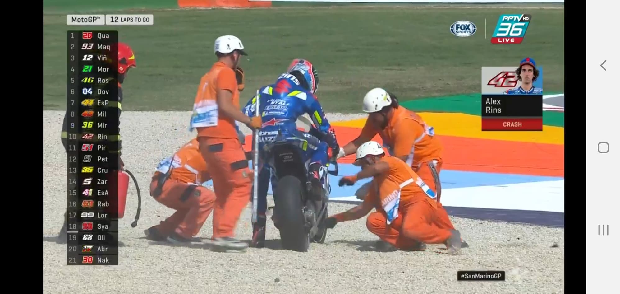 เหลืออีก 23 รอบ 20 ยังคงนำเป็นที่ 1 แล้วตามมาด้วย 93, 12 ส่วน 46 อยู่อันดับที่ 7 เหลืออีก 22 รอบ ผู้นำยังคงเป็น 20 ตามมาด้วย 93, 12 เหลืออีก 21 รอบ ผู้นำยังคงเป็น 20 ตามมาด้วย 93, 12 ซึ่ง 20กับ93 ทิ้ง 12 ไปประมาณ 1 วิกว่าๆ แล้ว 46 เสียบ 44 ขึ้นมาเป็นที่ 5 เหลืออีก 20 รอบ 20 กับ 93 ทิ้ง 12 ไปถึง 2.5 วินาที เหลืออีก 19 รอบ ผู้นำยังคงเป็น 20 และ93 ตามมาแบบติดๆ แล้ว 88 ก็ล้มลงไป เหลืออีก 18 รอบ ผู้นำยังคงเป็นกลุ่มเดิม เหลืออีก 17 รอบ ยังไม่มีอะไรเปลี่ยนแปลง 04 ขึ้นมาเป็นที่ 6 เหลืออีก 16 รอบ ผู้นำยังคงเป็นกลุ่มเดิมครับ แล้ว 63 ล้อมลงไปในโค้ง 4 เหลืออีก 15 รอบ 20 กับ 93 ห่างจาก 12 ที่เวลา 2.5 วินาที เหลืออีก 14 รอบ ผู้นำยังคงเป็นชุดเดิมไม่มีอะไรเปลี่ยนแปลง เหลืออีก 13 รอบ ผู้นำยังคงเป็นชุดเดิม เพิ่มเติมคือ 42 แซง 44 ขึ้นมาเป็นที่ 7 เหลืออีก 12 รอบ 42 โดนลงโทษ แล้ว 4 ก็ล้มลงไปในโค้ง 4