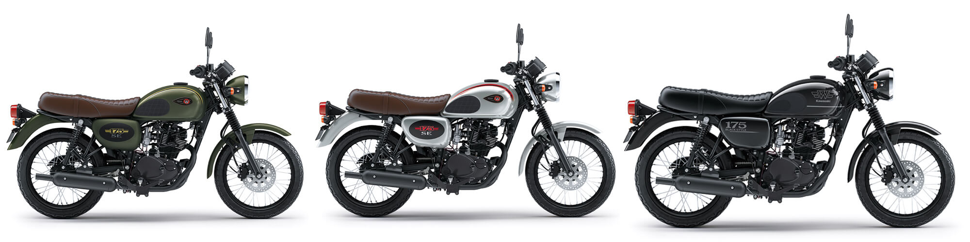 สำหรับรุ่น SE หรือรุ่นพิเศษของ Kawasaki W175 มีการเพิ่มสีใหม่ 3 สี รวมถึงสีเขียวใหม่ที่มาเป็นเอกลักษณ์ ตามด้วยสีเงินและ สีดำ โดยมีลักษณะเด่นที่เป็นล้อสีดำ ท่อไอเสียสีดำ ปลายท่อไอเสียแบบยาว และระบบกันสะเทือนหลังสีดำ อีกด้วย และสำหรับรุ่น TR SE มีสไตล์ที่ดูย้อนยุค มาพร้อมสีสันที่เป็นเอกลักษณ์ ตามสไตล์แบบของรถทางค่ายคาวาซากิ ที่ชวนให้นึกถึงวันครบรอบรุ่นพิเศษของ ZX-10RR ในซีรีส์ W175 อีกด้วย